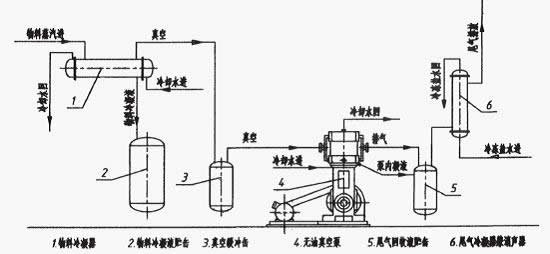 下圖是實際生產(chǎn)中應(yīng)用的一個物料減壓回收流程示意圖。圖中,物料蒸汽在主冷凝器中被基本冷凝成液體,但在真空條件下,氣體分子運動速度加快,氣體密度減小,物料的凝結(jié)溫度下降,冷凝器的總傳熱系數(shù)成倍縮小,因而在真空下物料冷凝(一次冷凝)往往不是很充分,尤其是低沸點溶劑類。未被充分冷凝的氣體一部份在真空泵內(nèi)隨著壓力的變化而液化,另一部份則在排氣側(cè)冷凝器中常壓下冷凝(二次冷凝)。 |